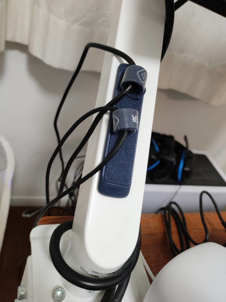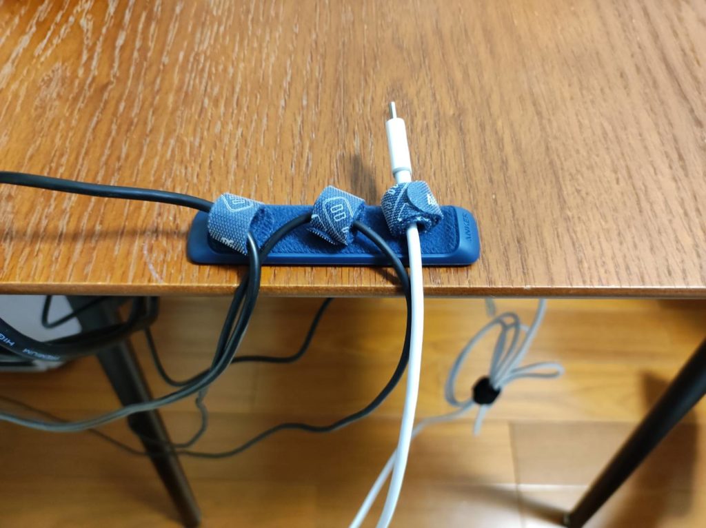 こんな感じでケーブルをまとめて床から上げておくケーブルホルダーを買いました.Ankerのケーブルホルダーは磁石タイプとこのようにマジックテープで留めるタイプがありますが,自分の場合は極端に長いケーブルがテーブルの下にあり,それを束ねて床から上げておきたいため,マジックテープタイプを購入しました.ちなみに磁石タイプはこのような商品です.